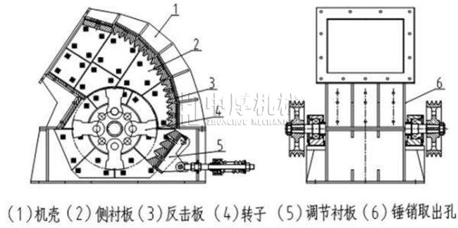 中厚重錘式破碎機可根據用戶要求調整蓖條間隙,改變出料粒度,以滿足不同用戶的不同需求。速轉動的錘體與物料碰撞面破碎物料,它具有結構簡單,破碎比大,生產效率高等特點,可作干、濕兩種形式破碎設備。該機的主要工作部件為帶有錘子(又稱錘頭)的轉子。轉子由主軸、圓盤、銷軸和錘子組成。電動機帶動轉子在破碎腔內高速旋轉。物料自上部給料口給入機內,受高速運動的錘子的打擊、沖擊、剪切、研磨作用而粉碎。