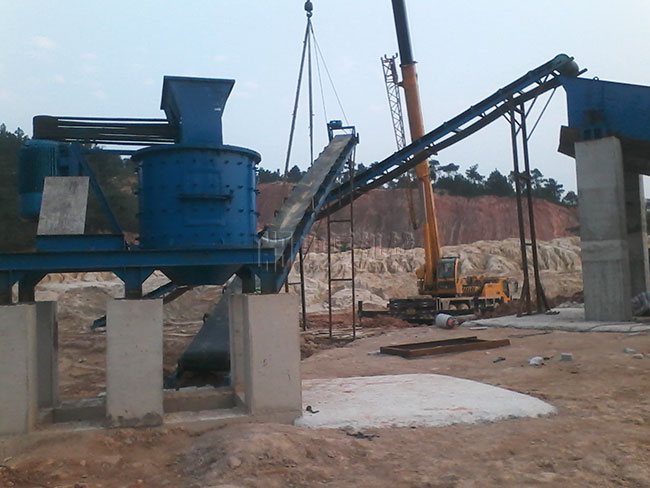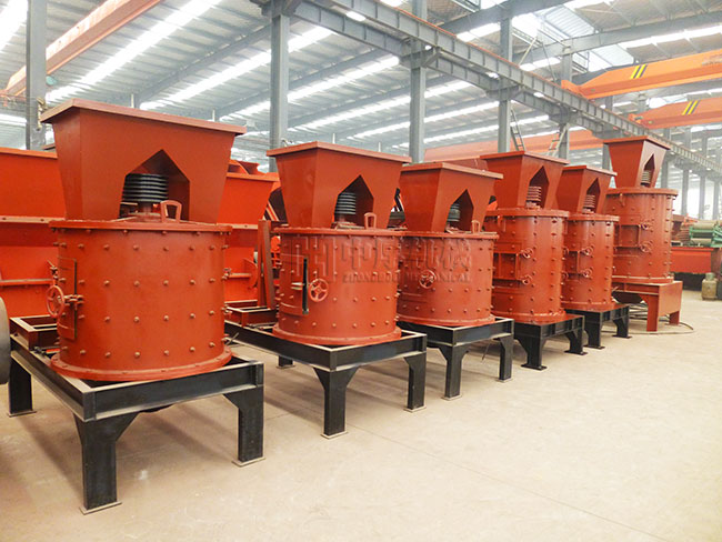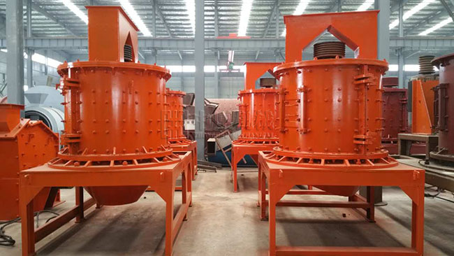 物料由復合式破碎機(復合破)上部垂直落入高速旋轉的葉輪內,在高速離心力的作用下,與另一部分以傘狀形式分流在葉輪四周的物料產生高速撞擊與粉碎,物料在互相撞擊后,又會在葉輪和機殼之間以物料形成渦流多次的互相撞擊、摩擦而粉碎,從下部直通排出,形成閉路多次循環,由篩分設備控制達到所要求的成品粒度。