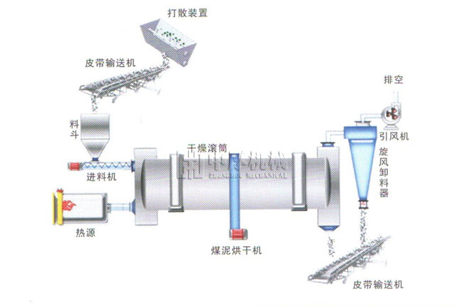 干燥的濕物料由皮帶輸送機(jī)或斗式提升機(jī)送到料斗,然后經(jīng)料斗的加料機(jī)通過加料管道進(jìn)入加料端。加料管道的斜度要大于物料的自然傾角,以便物料順利流入干燥器內(nèi)。干燥器圓筒是一個與水平線略成傾斜的旋轉(zhuǎn)圓筒。物料從較高一端加入,載熱體由低端進(jìn)入,與物料成逆流接觸,也有載熱體和物料一起并流進(jìn)入筒體的。隨著圓筒的轉(zhuǎn)動物料受重力作用運(yùn)行到較底的一端。濕物料在筒體內(nèi)向前移動過程中,直接或間接得到了載熱體的給熱,使?jié)裎锪系靡愿稍铮缓笤诔隽隙私?jīng)皮帶機(jī)或螺旋輸送機(jī)送出。