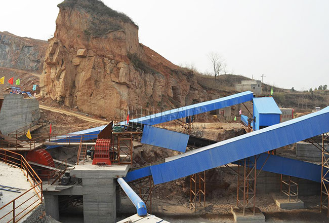 整條石料生產(chǎn)線由振動給料機(jī)、顎式破碎機(jī)、反擊式破碎機(jī)、振動篩、皮帶輸送機(jī)組成。大塊石料經(jīng)料倉由振動給料機(jī)均勻地送進(jìn)鄂式破碎機(jī)進(jìn)行粗碎,粗碎后的石料由膠帶輸送機(jī)送到反擊式破碎機(jī)進(jìn)行進(jìn)一步破碎;細(xì)碎后的石料由膠帶輸送機(jī)送進(jìn)振動篩進(jìn)行篩分,篩分出幾種不同規(guī)格的石子,滿足粒度要求的石子由成品膠帶輸送機(jī)送往成品料堆;不滿足粒度要求的石子由膠帶輸送機(jī)返料送到反擊式破碎機(jī)進(jìn)行再次破碎,形成閉路多次循環(huán)。成品粒度可按照用戶的需求進(jìn)行組合和分級,為保護(hù)環(huán)境。
