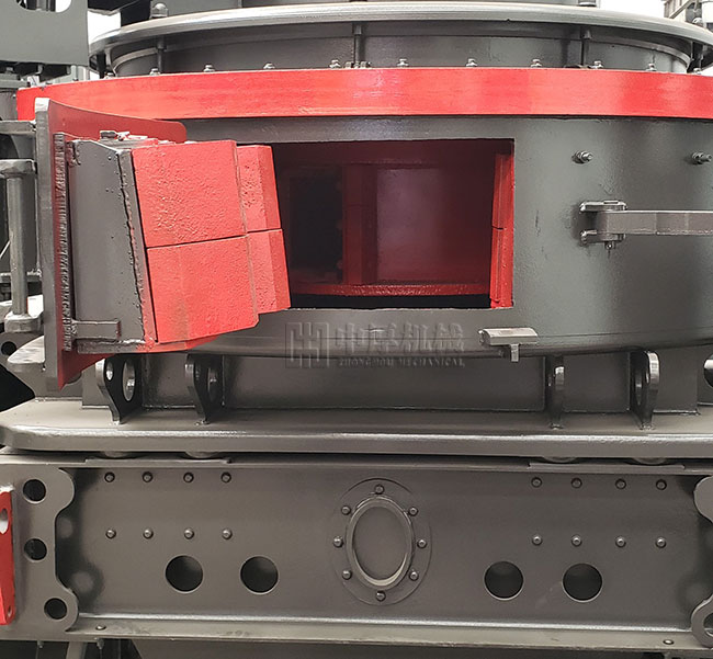 物料由進料斗進入沖擊式制沙機,經分料器將物料分成兩部分,一部分由分料器中間進入高速旋轉的葉輪中,在葉輪內被迅速加速,其加速度可達數百倍重力加速度,然后以60-70米/秒的速度從葉輪三個均布的流道內拋射出去,首先同由分料器四周自收落下的一部分物料沖擊破碎,然后一起沖擊到渦支腔內物料襯層上,被物料襯層反彈,斜向上沖擊到渦動腔的頂部,又改變其運動方向,偏轉向下運動,從葉輪流道發射出來的物料形成連續的物料幕。這樣一塊物料在渦動破碎腔內受到兩次以至多次機率撞擊、磨擦和研磨破碎作用。被破碎的物料由下部排料口排出。在整下破碎過程中,物料相互自行沖擊破碎,不與金屬元件直接接觸,而是與物料襯層發生沖擊、摩擦而粉碎,延長機械磨損時間。渦動腔內部巧妙的氣流自循環,消除了粉塵污染。