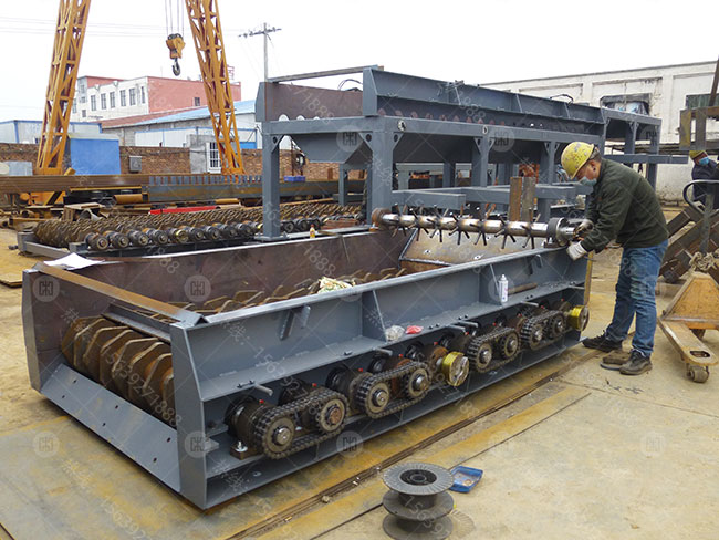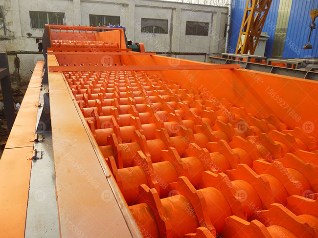 由電機(jī)驅(qū)動帶有不規(guī)則的形狀裝置的連動軸進(jìn)行翻轉(zhuǎn)運(yùn)動,篩面由很多根直線排布回轉(zhuǎn)軸承構(gòu)成,在滾軸上有相等的篩盤排布,滾軸通過齒輪帶動輪鏈傳動而旋轉(zhuǎn)的,其旋轉(zhuǎn)的的方向與原料流動的方向一致,軸與軸之間有間隙,鑲嵌在軸上的不規(guī)則耐磨裝置托起大粒度物料向前運(yùn)動,因?yàn)楹Y軸是按各不相同的運(yùn)行方向設(shè)計的,所以當(dāng)材料在運(yùn)行方向較高的地方運(yùn)行時的速度較快;當(dāng)材料在運(yùn)行方向較低的地方運(yùn)行時的速度較低緩。兩種各不相同的速度運(yùn)行下的材料,在篩面某一地方相匯時開始做軸向運(yùn)作,如此一來就使材料均衡性地分布在篩面上,達(dá)到了提高篩分的工作效率,小顆粒物料則落入分離機(jī)底部由皮帶機(jī)送出。