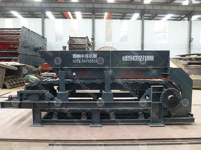 板式給礦機運轉是由電動機的轉動經過聯軸器、減速器帶動主軸裝置旋轉,并通過主軸裝置上的鏈輪與鏈條嚙合帶動鏈條上的鏈板作直線運動,達到將鏈板上的物料運送給破碎機的目的。驅動裝置通過變頻裝置調節給料速度。